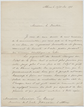 Créateur : Lortet, Louis (1836-1909)Date : 1873-10-12Noms de personnes citées : Madame Burnouf, Petrarki Anargyros -